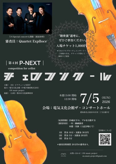 愛知県内でチェロコンクールなどを主催するピアチェーレNEXTのウェブページです。音楽を通じて地域社会の健全な発展をめざすことを目的とした事業を行っています。