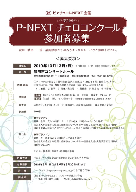 趣旨 本コンクールは、(社)ピアチェーレNEXTの理念に基づき、チェロの研鑽に励む愛知・岐阜・三重・静岡各県ゆかりの若人を対象に、更なる飛躍の機会を提供することを目的に、豊田市にて開催します。
