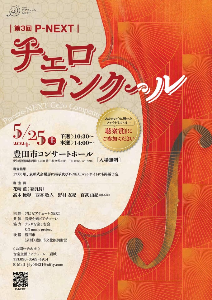 *主催 : (社)ピアチェーレNEXT (略称:P-Next) *共催 : 音楽企画ピアチェーレ *協力 : チェロを楽しむ会 ON music project *後援 : 豊田市、(公財)豊田市文化振興財団 |